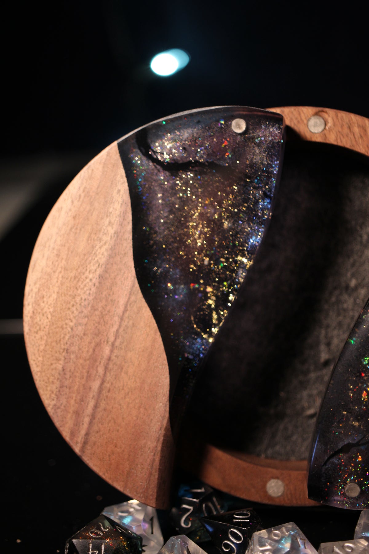 Roll a natural 20 for the gamer in your life with this hand made black walnut and epoxy dice box. This elegant 5.5” round dice box is crafted from high-end hardwood and features a curved split-opening. Rare earth magnets are incorporated to create a secure fit when the box is closed.